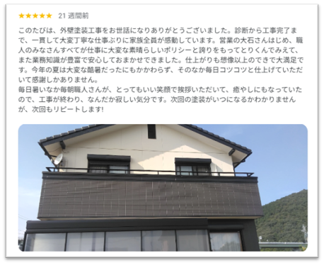 今回の写真付き口コミでも、外壁全体の仕上がりや色味、施工後の状態がはっきり分かります。