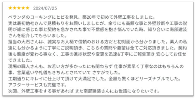 添付の口コミでも、診断・説明・工事中の対応・職人の様子までが具体的に書かれており、「何に満足したのか」がはっきり伝わります。