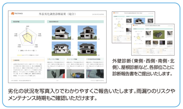 プロタイムズ岐阜南店(株式会社南部建装)では、外装劣化診断士による建物の状態チェックが行われ、写真や図面を含む報告書で現状がわかるように説明しています。