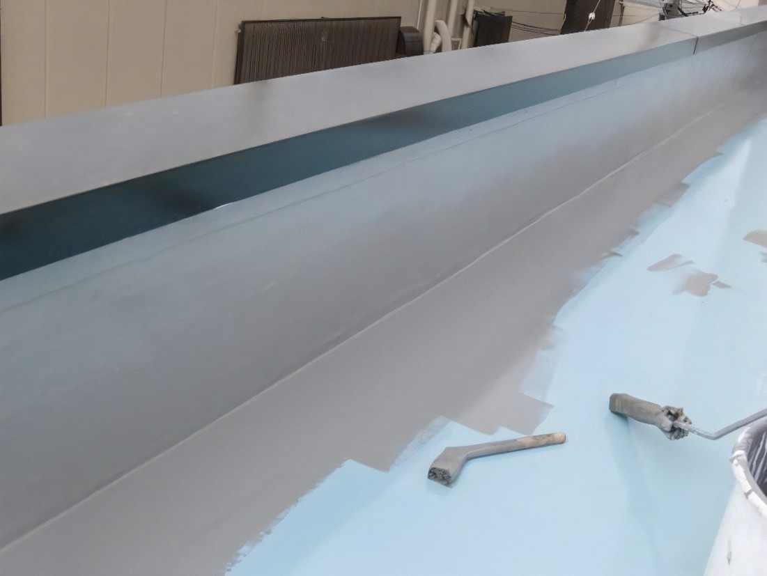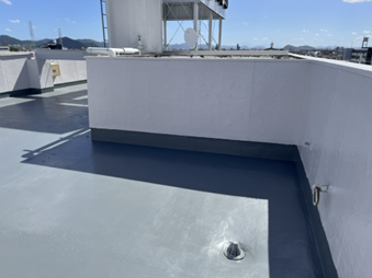 施工では、防水材として「ジョリエース(色:C-20グレー)」を使用。トップコート塗布を行なうことで、表面の防水性と美観を回復しています。