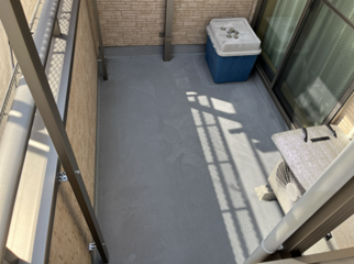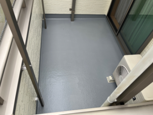 工事完了後は、ベランダ床に均一な光沢が戻り、落ち着いたグレー色で清潔感のある仕上がりとなっています。