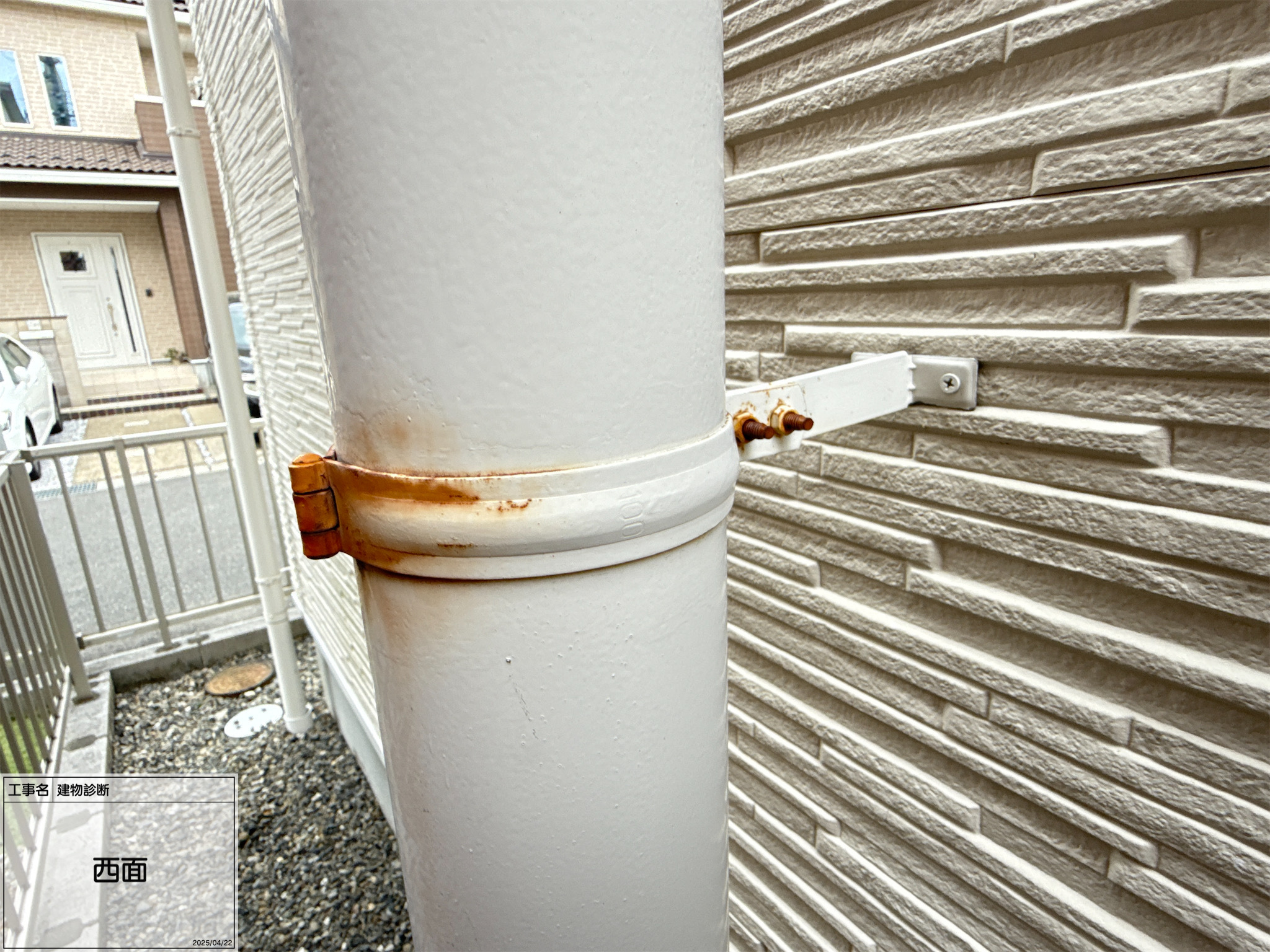 止め金具はサビる事がよくありますが、放置すると配管の劣化に繋がる為、交換工事かサビ止め塗料による補修をお勧めしています。